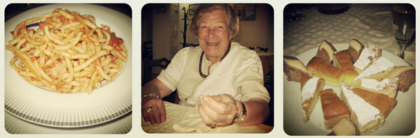 Luigi hatte mir ja versprochen, davon abzusehen, den ganzen Familienclan darüber zu informieren, wann ich komme. Von daher ist nur eine Tante zum Essen eingeladen worden, die bei ihm die Omastelle vertritt. Diese 89jährige rüstige Frau mit unzähligen Lachfältchen um Mund und Augen hört auf dem Spitznamen Zievola, was eine Mischung aus „Tante“ und „Teufel“ darstellt, und eigentlich überhaupt nicht zu ihr passt. Aber das gehört zum süditalienischen Humor. Zievola bringt mich noch während der Antipasti und dem anschließenden Gang mit Honigmelone und Schinken auf den neusten Stand, was die Situation der Familiemitglieder betrifft. So bin ich also beispielsweise schon beim Hauptgericht darüber im Bilde, dass Tante Anna zu dick geworden sei und deshalb das Haus nicht mehr verlassen könne, während Maria dazu ansetzte doppelt so viel Bucatini al Forno auf meinen Teller zu schaufeln wie auf Luigis. „Basta, Maria!“ rufe ich also, aber wohl nicht überzeugend genug, denn die zweite Kelle landet doch auf meinem Teller. „Iss, Corinna!“, sagt sie nur. „Du hast doch gesagt, dass du Bucatini al Forno möchtest.“ Ja, das stimmt zwar, aber ich hatte nicht gesagt, dass ich mehrere Kilo davon essen wolle, denn die Erfahrung hat mich gelehrt, dass nach der Pasta niemals Schluss ist.