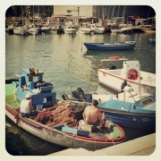 Allerdings wenden wir uns zunächst dem Meer zu, denn wir wollen die Altstadt an der Seeseite umrunden. So können wir durch die Markthalle auf dem Piazza Ferrarese vor dem „Teatro Margerita“ und dann auf der Promenade weiterschlendern. Selbst wenn gerade kein Markt stattfindet, riecht das Marktgebäude nach reifen Früchten, Fisch und Gemüse, als hätten sich die Jahrzehnte des Gebrauchs als dauerhafte Erinnerung ins Mauerwerk eingegraben. (7.10.2020: Das Marktgebäude wird seit ein paar Jahren restauriert und strahlt jetzt schon im neuen Glanz seiner frisch verputzten Fassade.) Im kleinen Fischerhafen schaukeln die Boote bereits träge an ihren Leinen, denn die Fischer sind natürlich längst mit ihrem Fang zum Markt, den Restaurants oder zu den Fischläden unterwegs, die sie beliefern. Einige sind sogar schon wieder zurück und flicken ihren Netze.