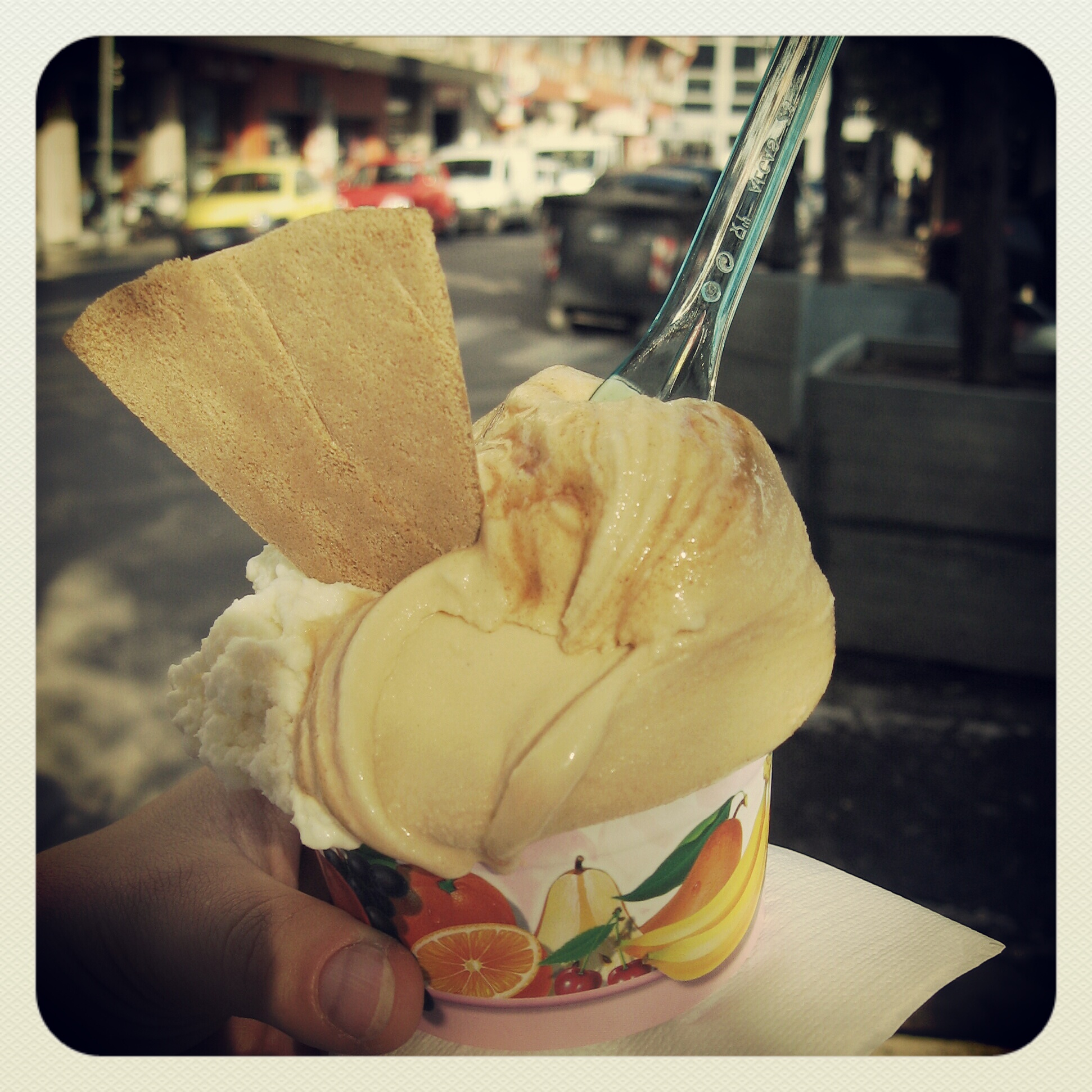 1991 fiel das 4000 Zuschauer fassende Gebäude einer Brandstiftung zum Opfer, die von der regionalen Mafia initiiert worden sein soll. Zievola erinnert sich noch daran, das dort früher fast jeden Abend eine Vorstellung gegeben wurde. Seit letztem Jahr werden nun endlich wieder eine Handvoll Produktionen eingekauft (Oper, Konzerte und Ballett) und wer nicht rechtzeitig im Voraus Karten bucht, der hat keine Chance. Bei Gasperini auf dem Corso Cavour oder auch in einer der anderen Filialen, die über die Stadt verstreut sind (Lungomare, Via Sperano u.a.), hat man jedoch immer eine Chance und zudem eine riesige Auswahl – und zwar beim besten Eis von Bari. Dort kann ich nie vorbeigehen ohne mindestens einen „coppa piccola“ zu kaufen. Mein Vater hält sich an Erdbeere und Melone. Meine Mutter probiert den Geschmack „baccio“ (Kuss) und Straciatella. Ich hingegen ziehe mit Whiskycremeeis und einer Sorte, die sich Galak nennt, von dannen. Einen gelungeneren Abschluss für einen Stadtbummel kann es gar nicht geben, auch wenn Maria später wieder behaupten wird, wir könnten gar nichts von ihrem Mittag schaffen, weil wir uns schon am Eis satt gegessen hätten.