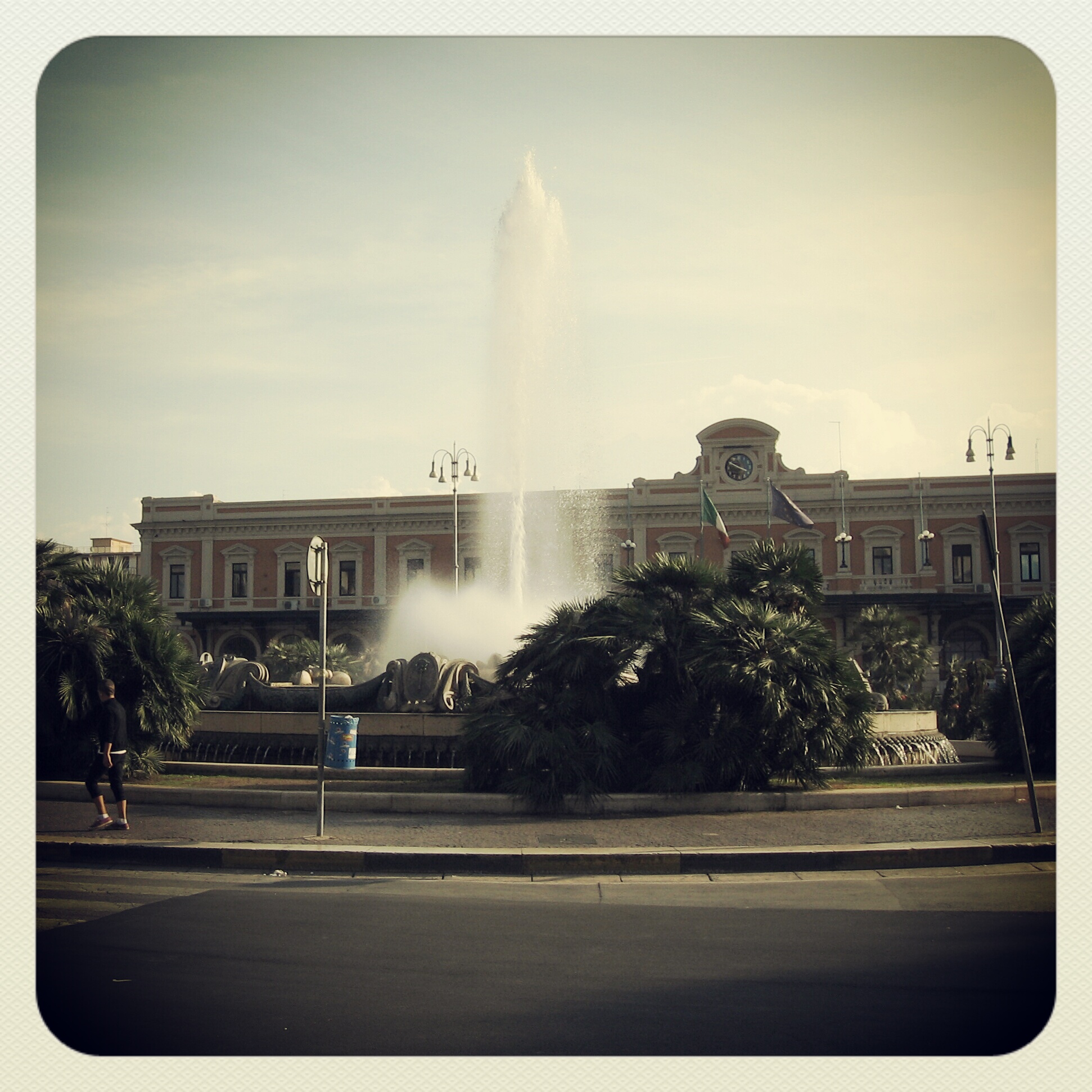 Der Zug bringt uns aus unserem Vorort Triggiano in gut fünfzehn Minuten ins ca. 15 km entfernte Stadtzentrum von Bari, wo ein großer Springbrunnen vor dem Bahnhof alle Ankommenden freundlich grüßend in Empfang nimmt. Das plätschernde Wasser der Fontäne, der blankgeputzte blaue Himmel und die mit ihren 30 Grad angenehme Julisonne machen sofort gute Laune.