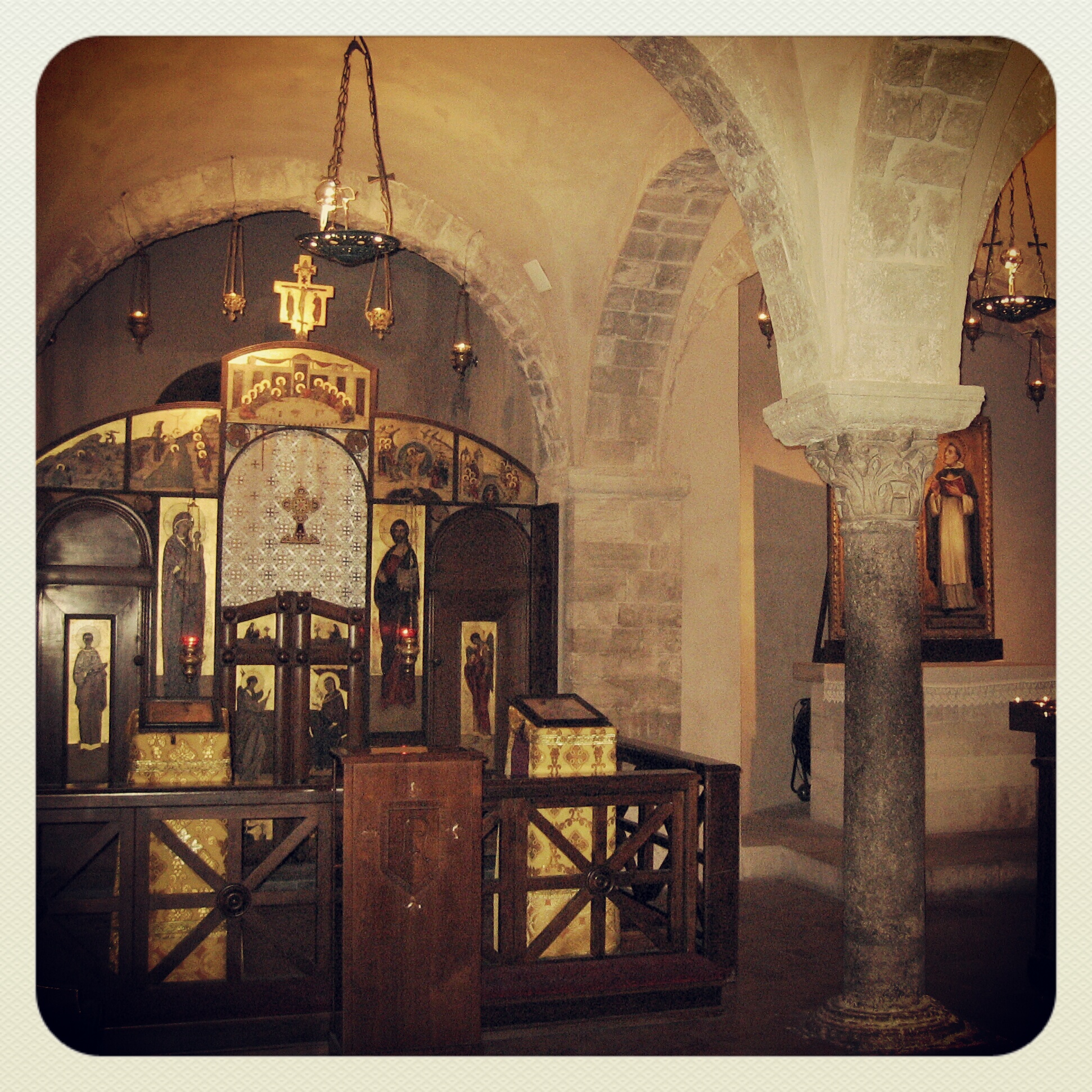 Wir treffen dort ein, als sich gerade eine Hochzeitsgesellschaft einfindet und auf den vorderen Bänken sortiert, während man der sichtlich aufgeregten Braut vor der Kirchentür den Schleier auf den roten Teppich drapiert. Die Touristen verhalten sich etwas leiser als sonst. Hier und da klicken die Fotoapparate. Wir schlendern auf der rechten Seite an der Büste des Heiligen Nikolaus vorbei, durchqueren fast die ganzen 55 Meter Länge des Inneren der Basilika und steigen dann die Treppen hinunter in die Krypta. Diese hat mich schon bei meinem ersten Besuch stark beeindruckt, nicht etwa ob der viel gepriesenen 26 Säulen, von denen keine der anderen gleicht, sondern weil dort eine Kapelle den orthodoxen Gläubigen zur Verfügung steht. Während also im Parterre die katholische Hochzeit gefeiert wird, singen Orthodoxen im Keller ihre Liturgien – ein schönes Zeichen für Toleranz.