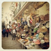 Die beiden Liebenden sind inzwischen Mann und Frau und machen auf der Treppe vor der Basilica Hochzeitsfotos mit unterschiedlichen Aufstellungen. Die weiblichen Hochzeitsgäste tragen fast alle trägerlose Kleidchen, an denen sie ständig herumzupfen, sowie bunte Stöckelschuhe. Ich stelle mir vor, wie sie am Ende des Tages darin herumstöckeln werden und bin froh über meine flachen Sandaletten. Wir schlagen uns also durch einen kleinen Torbogen in die Altstadt hinein. Die kleine Kirche San Gregorio bleibt rechts von uns liegen. Die mehrstöckigen Häuser stehen hier so dicht, dass auf die schmalen Gassen fast immer ein kühler Schatten fällt. Gleich rechter Hand gibt es einen kleinen Laden, der sich auf Brötchen und Getränke spezialisiert hat. Linker Hand bieten zwei kleine Geschäfte Sonnenhüte, apulische Keramik und Kitsch an. Jeder Tourist findet hier garantiert ein Mitbringsel. Wer länger in der Gegend bleibt, sollte sich die Keramik lieber an ihrem Entstehungsort z.B. in Grottaglie kaufen sowie für Kleidung und modische Accessoires einen Markt besuchen, da Märkte deutlich preiswerter sind.