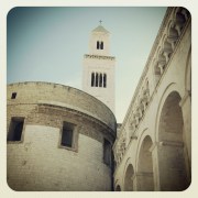 Wir orientieren uns am Turm von San Sabino, eine der wichtigsten Kirche Baris. Als wir ihn hinter uns gelassen haben, ist es nicht mehr weit bis zur „Basilika San Nicola“. Dort wollen wir den Durchgang vom Lungomare durch die Stadtmauer nehmen und uns ins touristische Getümmel stürzen, denn der Besuch dieser wuchtigen Kirche ist einfach ein „Muss“. Die Baresen sind unheimlich stolz auf die Überreste des Heiligen Nikolaus, die hier aufbewahrt werden, seit sie diese 1087 n.Chr. aus der Türkei entführt haben. Dieses denkwürdige Ereignis wird aus Sicht der Baresen als „Heimführung“ jedes Jahr im Mai mit einer Festwoche begangen, während die Türken in Abständen bei der italienischen Regierung anmerken, dass sie den Nikolaus, der doch immerhin in der heutigen Türkei gelebt und gewirkt hat, gern zurück hätten. Aber was zählen schon die paar Lebensjahre in der Türkei im Vergleich mit der nun schon 1000 Jahre währenden Anbetung in Bari?