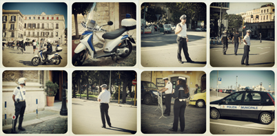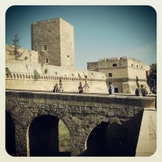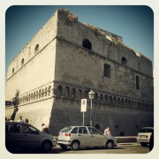 Wir überqueren den Platz und lassen die Kathedrale im Rücken liegen. Nun sind es nur noch ein paar Schritte zum Kastell, dessen äußere Mauern sich trotz des strahlenden Sonnenscheins bedrohlich gegen die Altstadt erheben. Seine Geschichte ist wechselvoll und unmittelbar mit der Geschichte Apuliens verbunden. Als Verteidigungsbollwerk und Herrschersitz errichtet, zum Gefängnis geworden, als Lazarett benutzt und in jüngerer Zeit zum Verwaltungsgebäude umgestaltet, wird das Kastell erst seit etwa zehn Jahren immer stärker als touristischer Höhepunkt behandelt und der Öffentlichkeit entsprechend zugänglich gemacht. Wir setzen uns in ein kleines Cafe und erfrischen uns mit einer Granita, was ich als Fruchtsaft-Sorbet bezeichnen würde. Man bekommt diese leichte Erfrischung, die ursprünglich aus Sizilien stammt, im Sommer in fast jedem Cafe oder jeder Gelateria serviert. Unter unserem Sonnenschirm hervorlugend entdecken wir größere geführte Gruppen. Ich vermute, dass im Hafen, der nicht unweit der Altstadt liegt, ein Kreuzfahrtschiff angelegt hat und deren Gäste nun in die Stadt ausströmen. Den Besuch des Kastells nehmen wir uns jedoch für einen anderen Tag vor, denn wir wollen noch die Piazza Mercantile erreichen und anschließend ein wenig auf der Seepromenade entlang schlendern, bevor wir uns wieder in Richtung Bahnhof aufmachen. Schließlich hat Mamma Maria uns eingeschärft pünktlich zum Mittagessen wieder zu Hause zu sein.