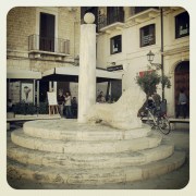 Da sich die Piazza Mercantile genau auf der anderen Seite der Altstadt befindet, umrunden wir sie auf einem „Innenring“ vom Kastell aus auf der Via Boemondo, hinter der Präfektur entlang und immer geradeaus, bis man nach ca. zehn Minuten wieder auf die Piazza del Ferasse mit der Markthalle trifft. Nun links wieder in die Altstadt hinein, an zwei kleinen Kirchen vorbei und sofort steht man auf dem alten Marktplatz. Hier findet man die von einem Löwen flankierte Schandsäule, die deutlich macht, wie eng Gewerbe und Gesetz zu damaligen Zeiten verknüpft waren. Was würden wohl heutige Banker und Geschäftsleute dazu sagen, wenn man sie mit den Händen an die Säule gefesselt und auf dem Löwen sitzend ihren geschädigten Klienten zur Beschimpfung freigeben würde? Keine Ahnung, aber die Säule wäre aktuell wohl ständig besetzt.