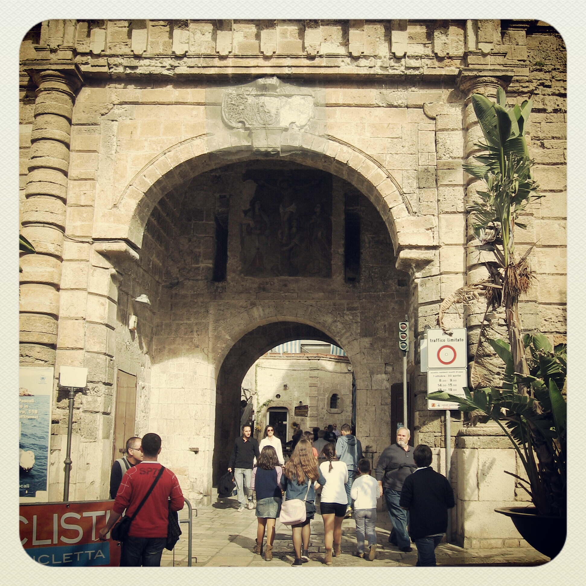 IMG_20121220_140827Über eine Treppe gelangen wir auf die Brücke und zum Altstadttor. Das Brückchen hat hier so ähnlich bereits vor ca. 1900 Jahren gestanden, denn der Weg durch Polignano war Teil der „Via Traiana“, die auf Wunsch des römischen Kaisers Traian die Orte Benevento und Brindisi an der Adria entlang verbinden sollte. Durch Bari und Polignano, das damals noch Neapolis („neue Stadt“) hieß, machte die Via Traiana noch zusätzlich einen kleinen Schlenker.