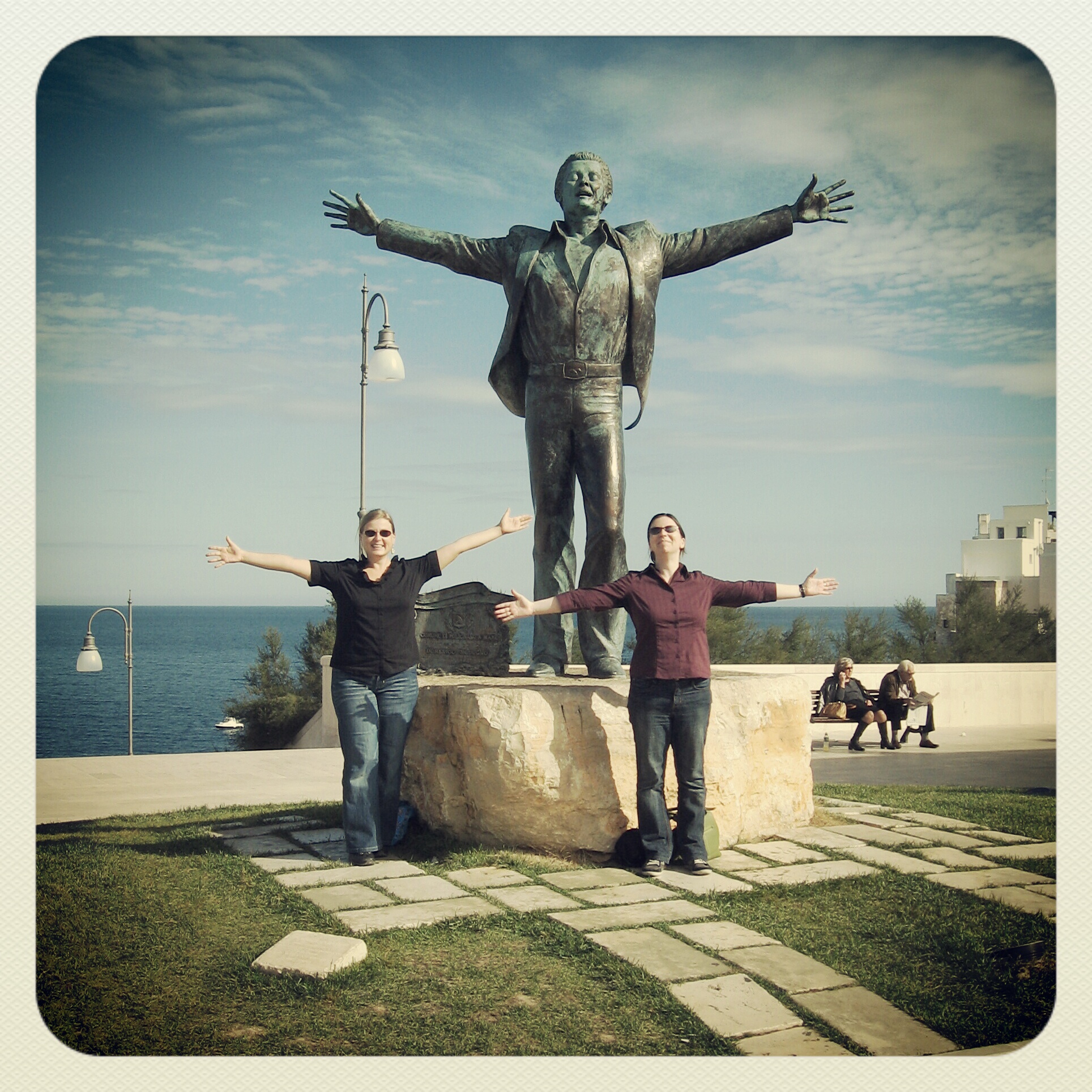 IMG_20121220_141101Auch wenn kuliniarische Köstlichkeiten häufig anziehender sind, als weiß gestrichene Häuser, von denen es in Apulien zugegebenermaßen recht viele gibt, sollte man nicht in Polignano gewesen sein, ohne einen Blick von der der Altstadt gegenüberliegenden Seite der Bucht auf das historische Zentrum genossen zu haben. Hier befindet sich zugleich das Denkmal für den wohl bekanntesten Sohn der Stadt. Oder sagen wir es anders: Sein Name, Domenico Modugno, ist vielleicht nicht so bekannt, aber den Song, der ihn international berühmt gemacht hat, kann wohl so ziemlich jeder ansingen. „Voooooooooolare, oooho! Cantare, ohohohoho!“ kann ich es mir dann auch nicht verkneifen. Aber weil so ein schöner Tag ist und Luigi ein Gesicht zieht, als habe er gerade furchtbare Zahnschmerzen bekommen, verzichte ich darauf, uns vor den anderen Touristen zum Affen zu machen. Im Gegenzug dafür muss er uns vor dem Denkmal knipsen. Voooooooooolare, oooho!
