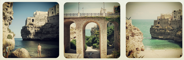 In Polignano angekommen muss man möglichst früh der Ausschilderung zu den Touristenparkplätzen folgen, sonst hat man schon die schmale Brücke über der Badebucht „Lama Monachile“ passiert und steht direkt vor dem Altstadttor. Hier sind kaum Parkplätze zu finden und die ohnehin engen Straßen machen das Navigieren auf dem strategischen Rückzug nicht gerade leichter.