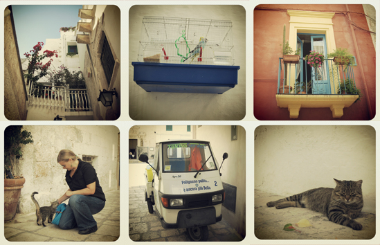 IMG_4206Zentrum der Altstadt ist die gemütliche Piazza Vittorio Emanuele II., die flankiert wird von Bars, Geschäften und der Kirche Santa Maria Assunta. Wir wollen einen Blick ins Innere werfen, wo sich Skulpturen des bekannten Renaissancekünstlers Stefano da Putignano aus dem 17. Jahrhundert und andere kleine Kostbarkeiten befinden. Es findet jedoch gerade eine Messe statt, und statt alte Kunstwerke zu sehen, werden wir Zeugen der Tatsache, dass in Polignano der Nachwuchs an gläubigen Katholiken gesichert ist. Der Priester ist in ein lautes „Gespräch“ mit fröhlichen Zurufen aus drei Bankreihen voller Kinder verwickelt und bespricht eine Bibelstelle mit ihnen. Die Kirche ist auch abgesehen von den Kindern gerammelt voll, obwohl es sich nicht um einen Feiertag handelt. Wir lassen also unseren Blick nur kurz schweifen und ziehen uns dann wieder ins Freie zurück, um noch ein wenig zu bummeln. Wir begegnen auf unserem Streifzug nicht nur der örtlichen Putzkolonne, Touristen und zweibeinigen Stadtbewohnern, sondern auch zwei Kanarienvögeln, die ihren Käfig an eine Außenwand verlegt haben. Ein paar Gassen weiter, erhalte ich die Gelegenheit, ein Kätzchen zu streicheln, während seine Katzenmama an einer Hauswand die Strahlen der Herbstsonne genießt.