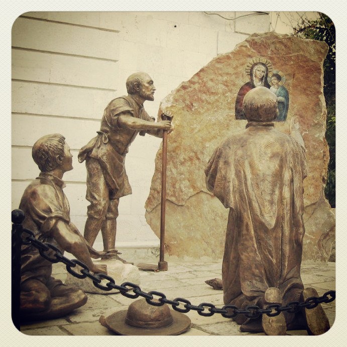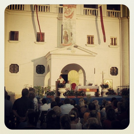 IMG_6124Von dort aus schlägelten sich Marktstände bis zu einer Klosteranlage mit einer vom letzten Sonnenlicht wunderbar warmgolden angestrahlten Kathedrale, vor der gerade eine Messe unter freiem Himmel gehalten wurde. Bis wir dorthin gelangten, erzählte mir Luigi noch von einem der zahlreichen Wunder, das die Maria des Brunnens verursacht haben soll. Demnach erschienIMG_20130828_141529 diese einer gehbehinderten Frau im Traum, welche sich am folgenden Morgen zum Brunnen schleppte und sich dort angekommen plötzlich so erstarkt fühlte, dass sie mit einem Male wieder richtig laufen konnte. Inzwischen hatte der Geistliche aus der ersten Geschichte bereits an Ort und Stelle eine Kapelle erbauen und weihen lassen, so dass nun die Wunder auch ihre christliche Ordnung hatten.