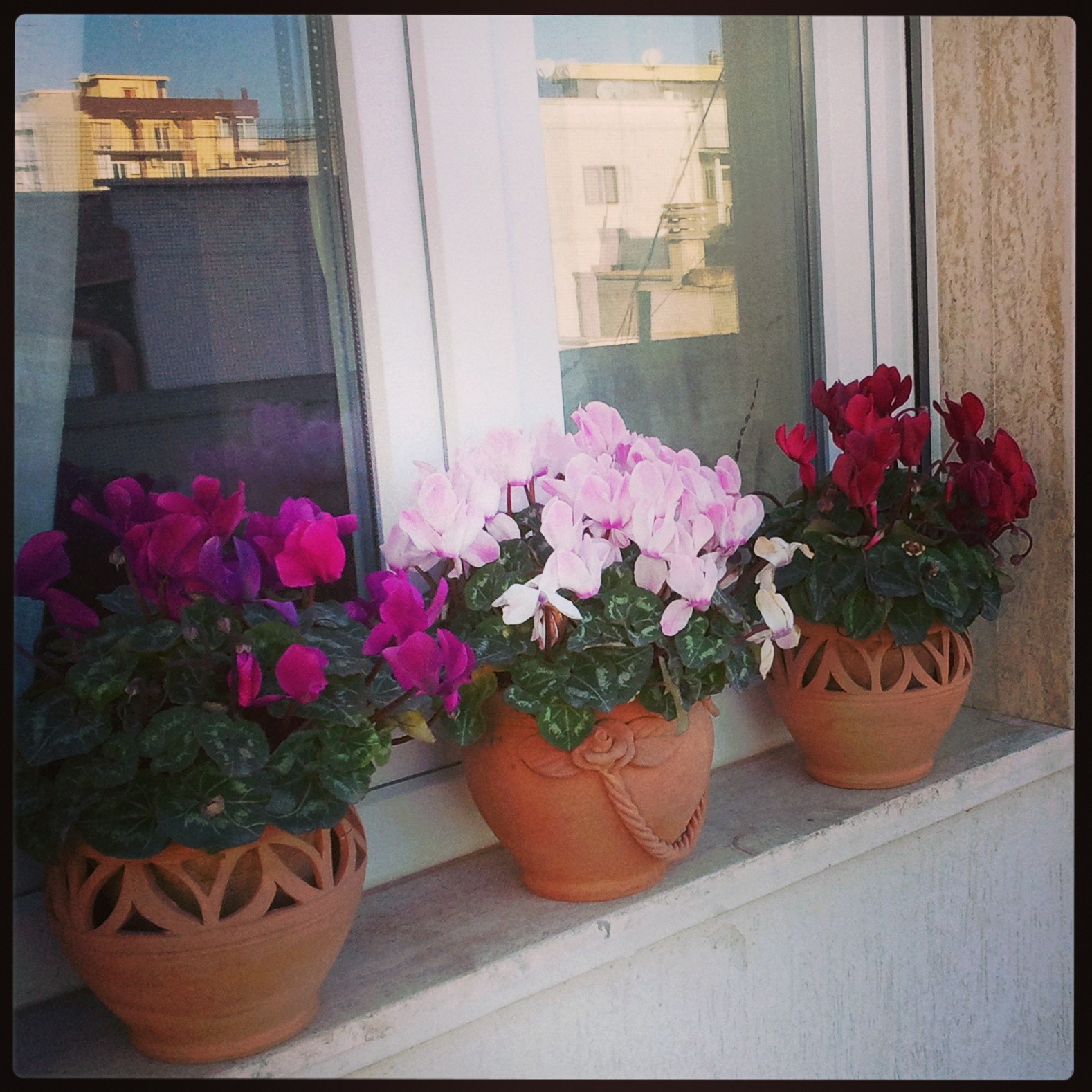 Die Alpenfeilchen blühen seit September ununterbrochen und grüßen uns schon am frühen Morgen, wenn wir den Rolladen des Schlafzimmerfensters hochfahren.