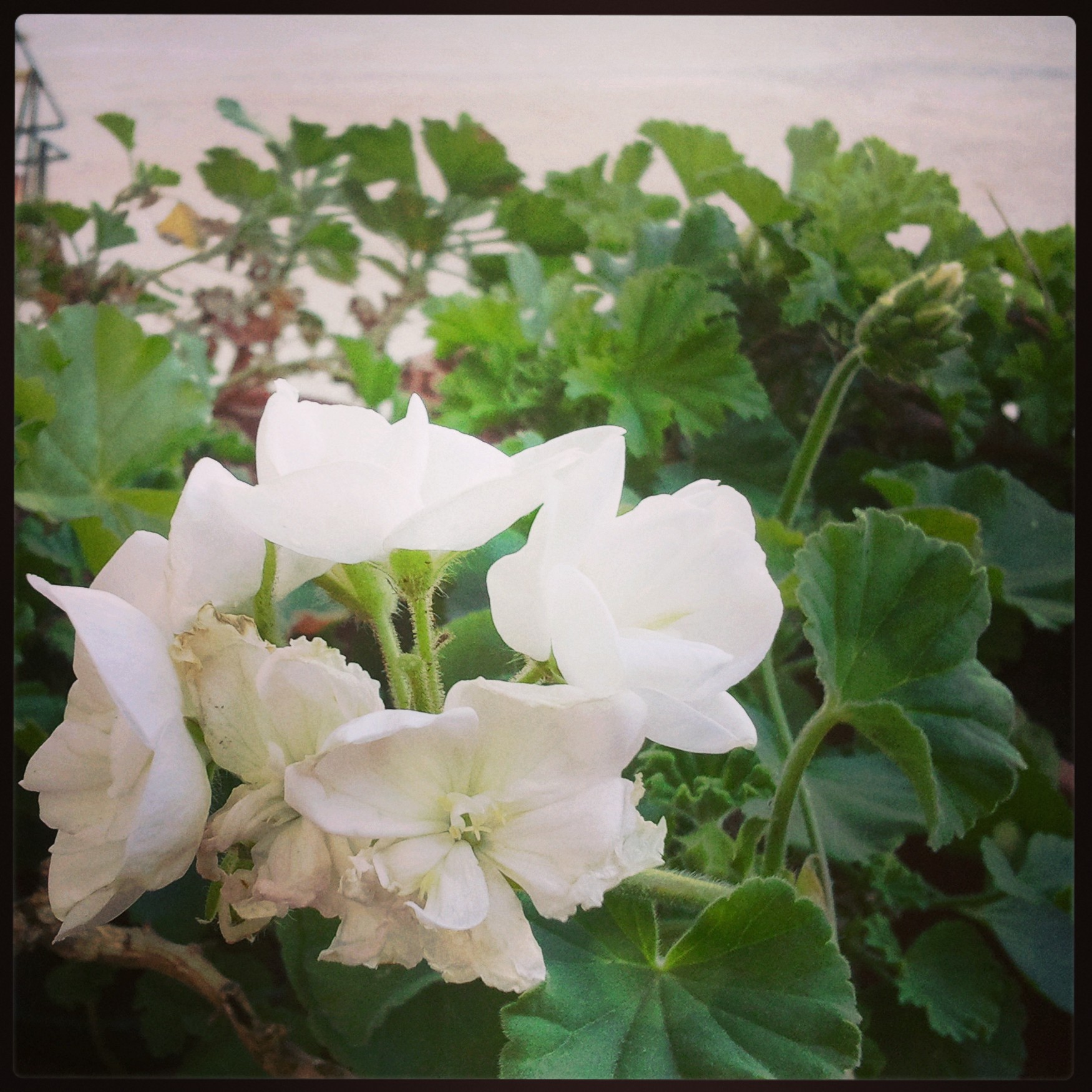 Eine der Herbstastern und eine weiße Geranie hören seit dem Spätsommer ebenfalls nicht auf zu blühen. Die „Geldbäume“ sind Ginas Territorium, weil sie dort Insekten jagen kann.