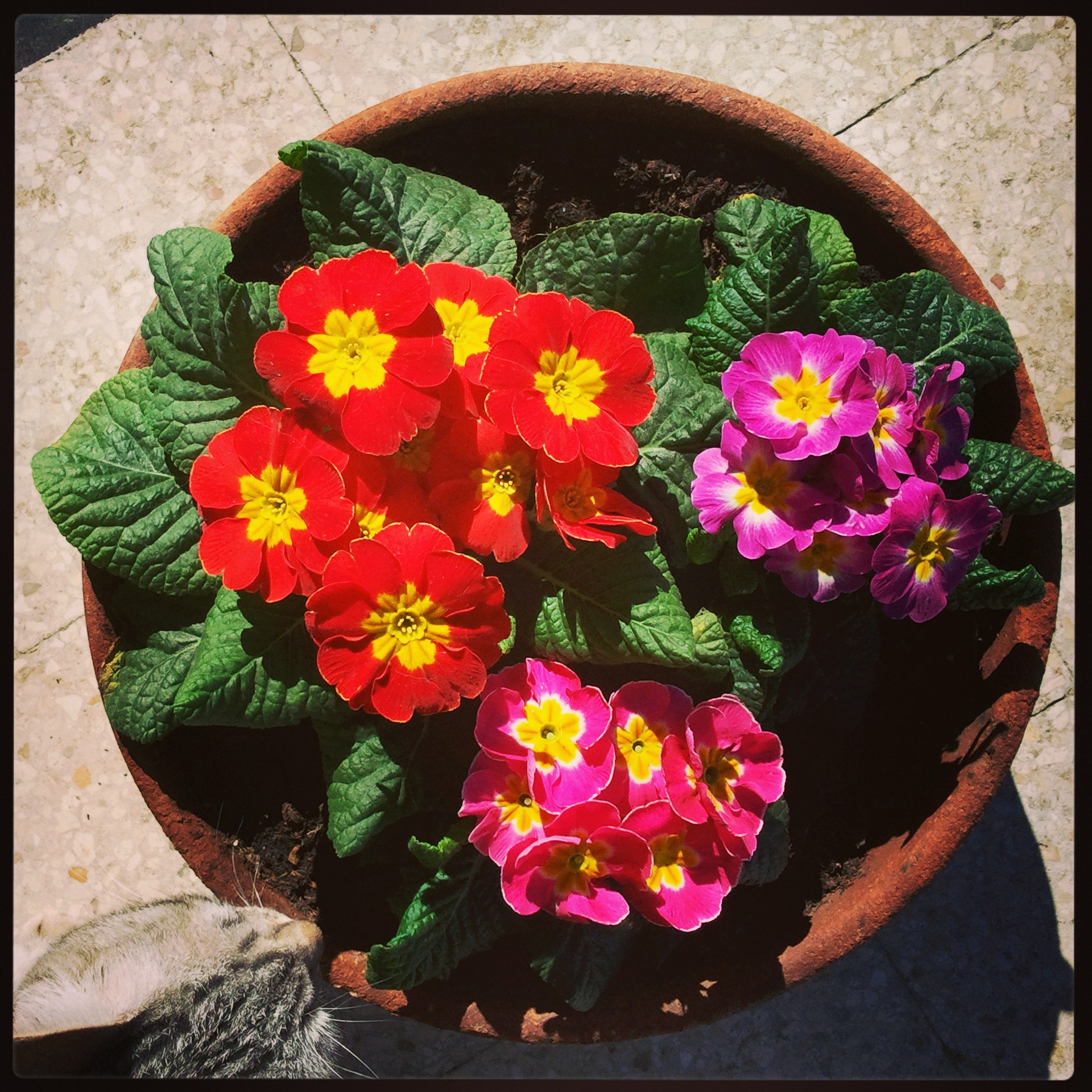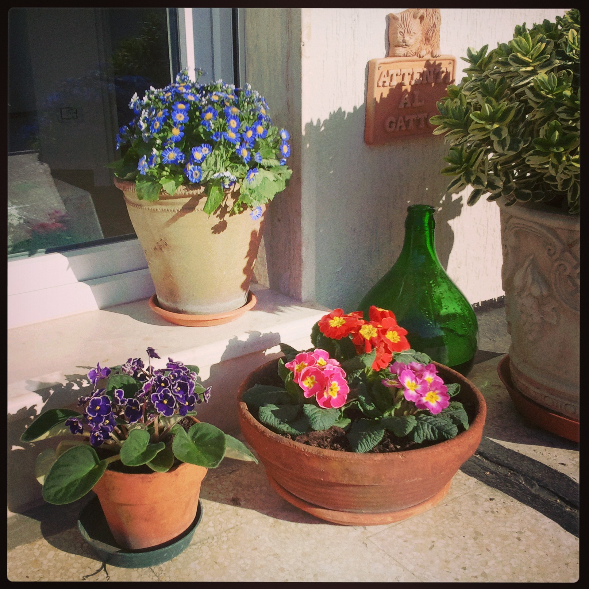 In meinem fast verheilten, hellgrünen Daumen hat es mich auch schon gejuckt, so dass ich im Lieblingsbaumarkt nicht an den Rosen vorbeigekommen bin und auf dem Markt die ersten Primeln mitgehen ließ. Die blauen und die lilafarbenen Blumen sind Geschenke von Pasquale und Luigi.