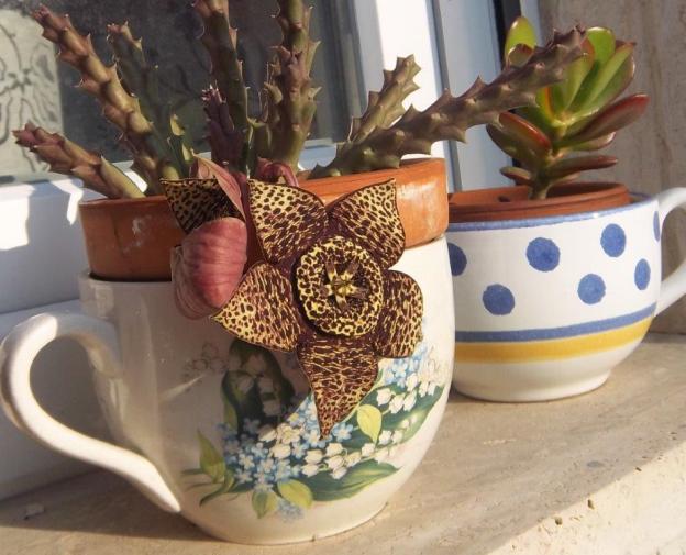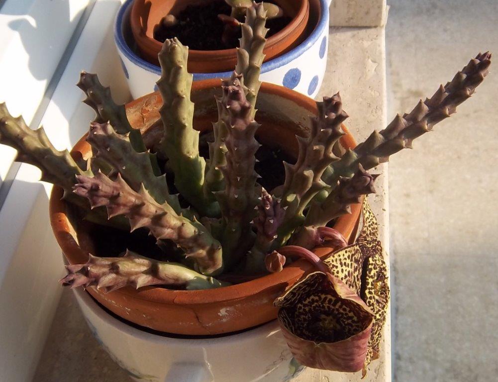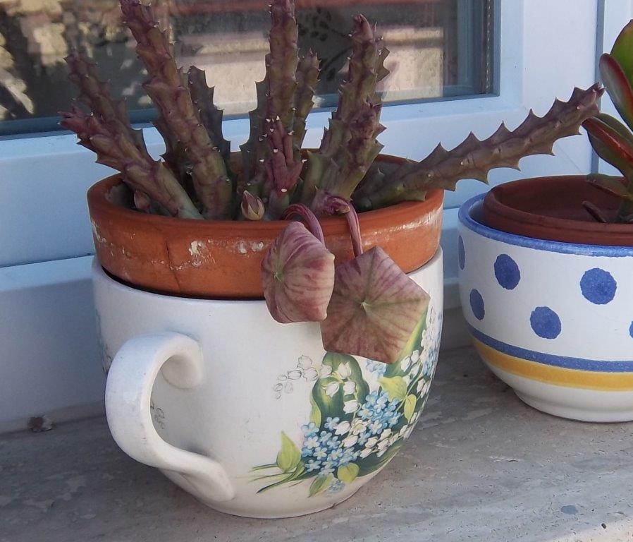 Auf unserem Wohnstubenfensterbrett stehen ein paar Kakteen und andere hitzeresistente Pflanzen in praller Sonne. Vor ein paar Tagen bemerkte ich an einem Gewirr aus Stachelstäben zwei Blütenansätze, die mich an Bastelstunden in meiner Kindheit und an gefaltete Taschen aus Buntpapier erinnerten.
