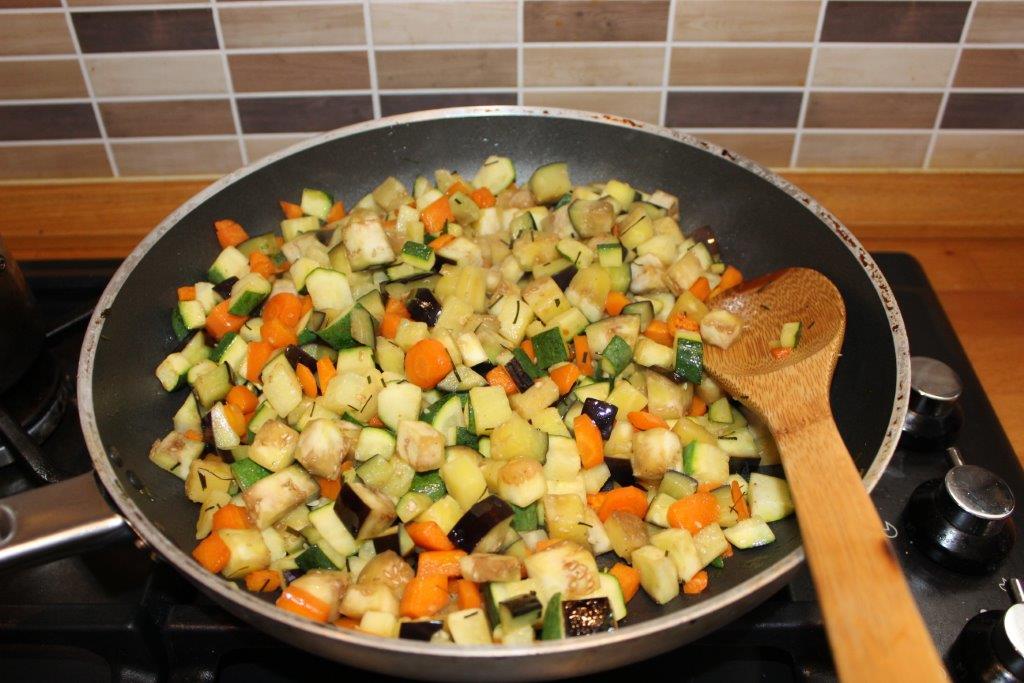 Gemüse bratenFür Gemüse-Couscous kann man eigentlich alles Gemüse verwenden, das einem schmeckt oder sich ohnehin gerade im Kühlschrank befindet: Karotten, Zucchini, Aubergine, Paprika, Tomaten oder Zwiebeln machen sich ganz wunderbar. Ich habe für 4 Personen drei kleine Karotten, zwei kleine Zucchini und einer kleine Aubergine nebst ein paar Tomaten in Würfel geschnitten und in einer Pfanne mit ein bisschen Knoblauch, Salz und Pfeffer angebraten. Für 250 g Couscous wird ein Viertel Liter Wasser mit Couscous dazueinem Esslöffel Öl und einem Teelöffel Salz zum Kochen gebracht und, wenn es sprudelt vom Feuer genommen; dann den Couscous einrühren und ein paar Minuten quellen lassen. Danach noch einmal drei Minuten kochen und ein bisschen Butter unterrühren. Zum Schluss alles in der Pfanne zusammenrühren und mit etwas Basilikum abschmecken. Fertig.