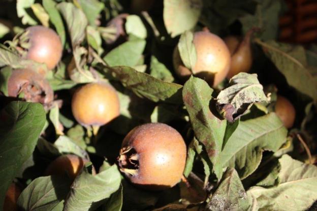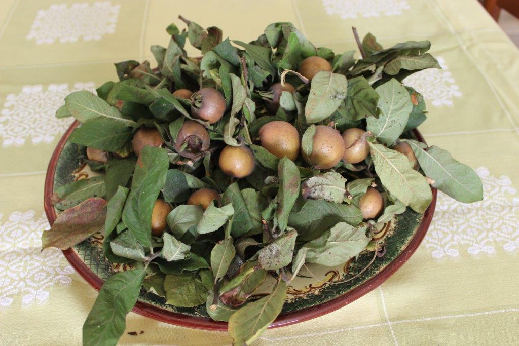 Mispeln kannte ich bisher nur aus dem späten Frühjahr. Tatsächlich sehen diese von der Form her so ähnlich aus wie Pinos Wintermispeln; also wie das, was von Rosenblüten übrig bleibt, wenn alle Blütenblätter abgefallen sind. Allerdings sind die Frühlingsmispeln größer und sehr viel gelber. Selbst Pasquale, dem ich Pinos Besonderheit am nächsten Tag zeigte, hatte noch nie von Wintermispeln gehört. Doch seit Wikipedia gibt es keine Entschuldigung mehr dafür, etwas nicht zu wissen. Also schnell im Onlinelexikon überprüft, ob es überhaupt Wintermispeln gibt, und tatsächlich scheint es sich bei den Früchten auf meinem Küchentisch um die „Echte Mispel“ zu handeln.