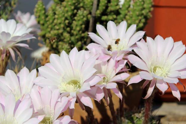 Ich erwähnte bereits (vermutlich mehrmals), dass ich ein großer Kakteenfan geworden bin, seit die von unseren Vorbewohnern hinterlassenen Kakteen sich nicht nur vervielfachen sondern auch mehrmals im Jahr auffällige Trichterblüten entwickeln, welche die Größe der Kakteen deutlich überbieten. Aktuell rollt die zweite Blütenwelle über die Terrasse und heute früh ist mir aufgefallen, dass die weiß-rosa Trichter die reinsten Bienenmagneten sind. Es brummte und summte so fröhlich in der Kaktusecke, dass ich das hastige Treiben fotografisch festhalten musste. Die fleißigen Bienen müssen sich auch beeilen, denn die Pracht dauert jetzt im Sommer nur einen Tag. Dann fällt die Blüte schon in sich zusammen.
