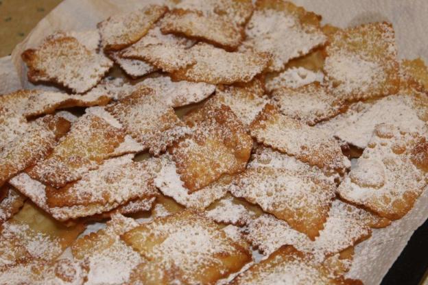 Je mehr sich in Bari und Umgebung das Ende der Karnevalssaison nähert, desto häufiger und massiver treten frittierte, dünne Teigplättchen in Bäcker- und Konditorenläden oder auch auf unserem Sonntagsmittagstisch in Erscheinung. „Chiacchiere“ (Plauderei) nennen sie sich oder „bugie“ (Lügen) und kommen ursprünglich aus Neapel. Während ich Karnevalsrummel immer als befremdlich empfand und mich hier in Apulien nur einmal aus Forschungszwecken für diesen Blog in die apulische Hochburg des närrischen Treibens gewagt habe, stehe ich dem süßen Traditionsgebäck alles andere als ablehnend gegenüber. Bisher haben wir die mit Puderzucker bestäubten Teigstreifen gelegentlich in der Bäckerei unseres Vertrauens gekauft. Doch da wir neben einer gut 50 Jahre alten Pastamaschine auch Tante Anna besitzen, die ihres Zeichens ein unerschöpfliches, auf Großfamilien ausgelegtes Kochbuch ist, wollten Luigi und ich in diesem Jahr selbst ausprobieren, wie man diese knusprige Verführung herstellt.