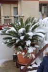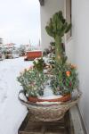 Blassrosa oder gelbe Blüten mit einem lockeren Schneehäubchen – was auf den Fotos so idyllisch wirkt, hat in Wahrheit einen bitteren Beigeschmack. Hier ist es nur der spaßeshalber gehegte Kübelgarten auf unserer Terrasse, aber tatsächlich war in Apulien die Blüte der Mandel-, Aprikosen- und Pfirsichbäume bereits in vollem Gange, als uns der plötzliche Wintereinbruch erwischte.