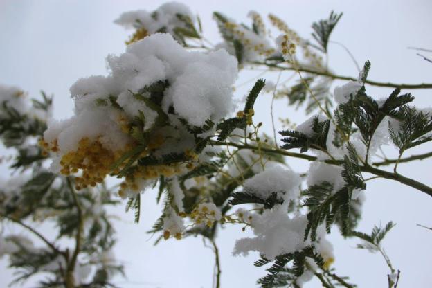 Blassrosa oder gelbe Blüten mit einem lockeren Schneehäubchen – was auf den Fotos so idyllisch wirkt, hat in Wahrheit einen bitteren Beigeschmack. Hier ist es nur der spaßeshalber gehegte Kübelgarten auf unserer Terrasse, aber tatsächlich war in Apulien die Blüte der Mandel-, Aprikosen- und Pfirsichbäume bereits in vollem Gange, als uns der plötzliche Wintereinbruch erwischte.