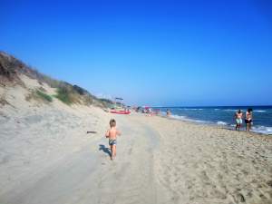 Mit kleinen Kindern geht man morgens an den Strand und verlässt ihn gegen 10, spätestens um 11 Uhr schon wieder. Das hat vor allem in der Hauptsaison den Vorteil, dass man sich das glasklare Meer mit relativ wenigen Mitmenschen teilen muss. Man verbraucht weniger Sonnencreme, vermeidet Staus und ist pünktlich zur deutschen Mittagszeit wieder zu Hause.