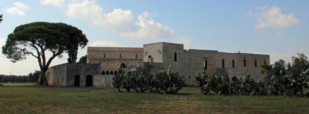Auf dem Weg zu den Traumstränden von Lecce trafen wir ca. 15 Autominuten in Richtung Torre Chianca auf etwas, dass sich hinter hohen Mauern und einer Kaktusfeigenhecke versteckte, jedoch angesichts eines davor geparkten Reisebusses von touristischem Interesse sein musste. Sollte es sich vielleicht um eine sehenswerte Masseria handeln? Wir parkten ebenfalls und folgten einigen herumstreunenden Fotoapparaten durch einen Torbogen in den Innenhof, dessen Zugang jedoch durch einen Zaun blockiert wurde.