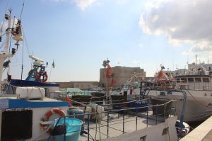 Vor dem Stadtschloss, einem Kastell aus dem 16. Jahrhundert, liegt malerisch der Hafen mit Fischkuttern und kleinen Fischerbooten. Anlässlich einer im Kastell stattfindenden Fotoausstellung wurden großformatige Fotos auf viele historische Gebäude Monopolis aufgebracht und geben den alten Mauern einen zusätzlichen Aufmerksamkeitswert. Eine schöne Idee!