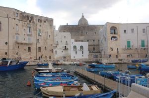Vor dem Stadtschloss, einem Kastell aus dem 16. Jahrhundert, liegt malerisch der Hafen mit Fischkuttern und kleinen Fischerbooten. Anlässlich einer im Kastell stattfindenden Fotoausstellung wurden großformatige Fotos auf viele historische Gebäude Monopolis aufgebracht und geben den alten Mauern einen zusätzlichen Aufmerksamkeitswert. Eine schöne Idee!