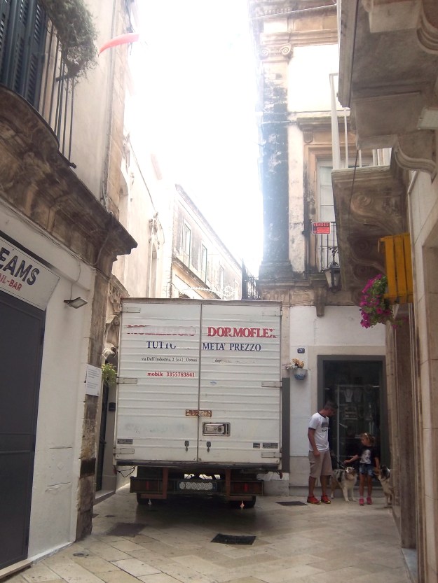 Wer sein fahrtechnisches Können unter Beweis stellen will, ist in süditalienischen Altstädten gut aufgehoben. Hier zeigte der Fahrer eines Transporters, welcher Mitte Juli Material zum Bühnenaufbau in die historische Altstadt von Martina Franca gebracht hatte, was er drauf hat.