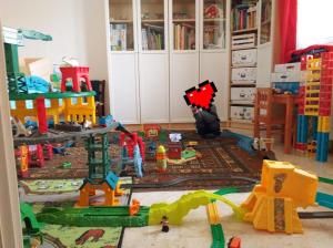 Apropos rausgehen. Auf der Terrasse befindet sich im Sandkasten die „Paw Patrol-und – Baufahrzeuge-Welt. Kleine Hunde retten hier kontinuierlich ausgegrabene Schätze vor dem Nuckeldieb, der dank des fortgeschrittenen Alters von Davide nicht mehr nur Nuckel, sondern  auch alles andere diebt. Doch die beste Welt ist die Mamas-Müllecke-Welt. Hier gibt es leere und halbvolle Farbbüchsen, Holzreste, Gemüsekisten und andere Dinge, mit denen Kinder nicht spielen sollten.