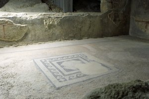 Tatsächlich gehen wir nur wenige Schritte. Dann schließt er eine Gittertür unterhalb eines mehrstöckigen Wohngebäudes auf. Wir treten unter eine Überdachung und stehen auf einer Rampe über einem Fragment einer römischen Straße, die dereinst in den Felsen gehauen worden war – über der Überdachung erhebt sich auf starken Betonpfeilern das Wohngebäude in den Himmel. Neben der steinigen Straße sehen wir die Mauern des „Domus Romana di Colle Montescupolo“, eines römischen Hauses, dessen Wasserleitung und die private Therme der hier gelebt habenden römischen Familien. Der Führer zahlt sich aus, denn er erklärt mit Leidenschaft, was wir sehen und wie es dazu gekommen ist, dass man an dieser Stelle etwas sieht.