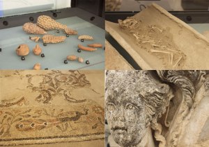 Ein kleiner Auszug aus dem „Stolz“ des Antiquariums der „Basilica San Leucio“: Keramikfrüchte als Grabbeigabe, ein Kinderskelett, ein Pfauenmosaik und einer der zwei Minerva-Köpfe.
