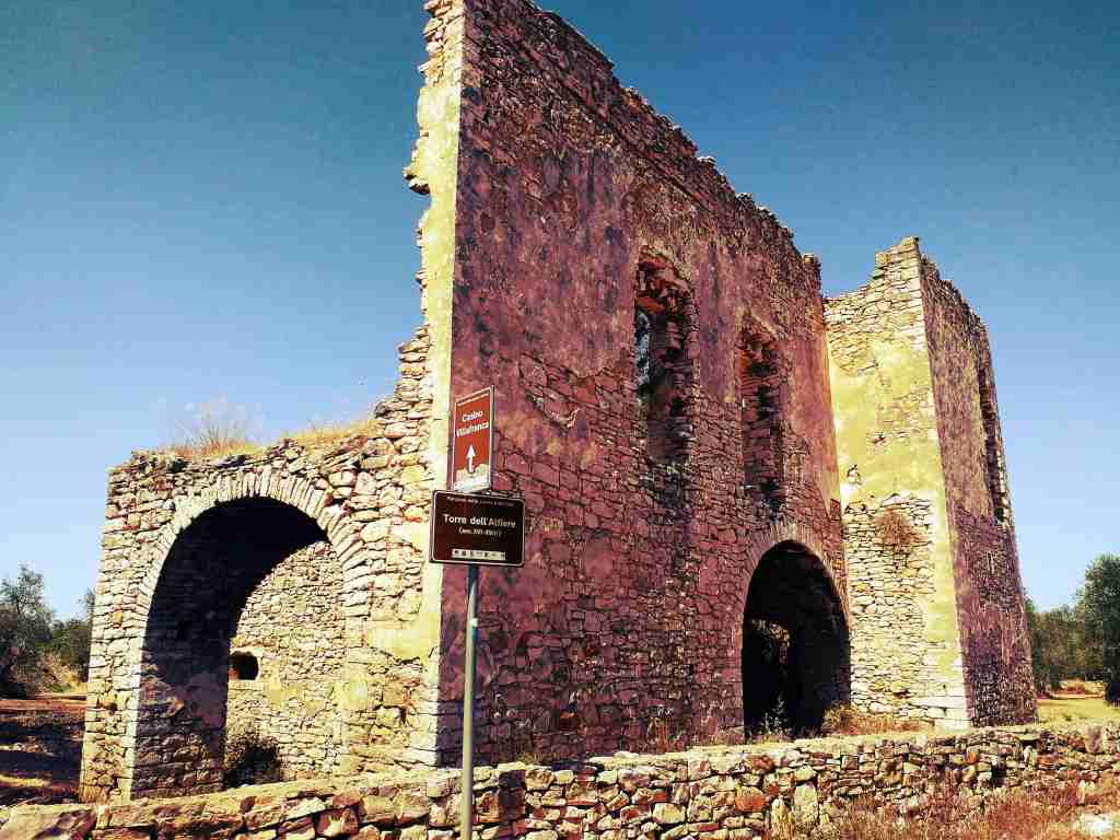 Vom „Torre Del Alfiere“ aus dem 16. bis 18. Jahrhundert stehen gerade noch die 3 Grundmauern und im ersten Stock. wo er noch nicht eingefallen ist, recken sich Sträucher in den strahlend blauen Sommerhimmel. Ringsherum muss es erst kürzlich gebrannt haben. Das könnte an dem abgelegten Müll am Wegesrand gelegen haben, aber das ist nur eine Vermutung. Ich weiß auch nicht, warum mich solche Ruinen anziehen. Vielleicht ist mir beim Schnüffeln zwischen Trümmern irgendwann mal ein Stein auf den Kopf gefallen und das ist nun das Resultat. Wie schön, dass am Torre gleich ein Wegweiser das nächste „Highlight“ zeigt, welches in ein paar Jahren vielleicht ebenfalls nicht mehr zu fotografieren sein wird – das „Casino Villafranca“.