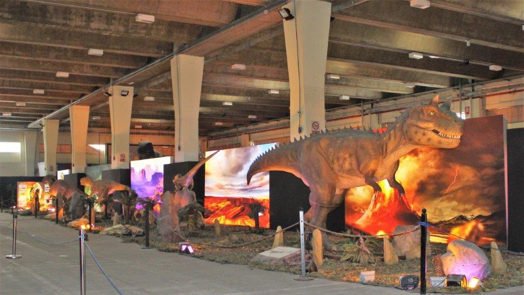 Alle Tiere bewegen Kopf, Schwanz oder andere Körperteile und wecken dadurch immer wieder die Neugier der Besucher. Währenddessen ertönen aus Lautsprechern gruselige Dinosauriergeräusche. Natürlich kommt auch die Didaktik nicht zu kurz: Kleinere Informationstafel klären über Namen, Vorkommen auf, zeigen ein paar Fakten wie Größe und Art. Außerdem wird die Bedeutung des Namens auf Italienisch genannt. Große, farbige und beleuchtete Informationstafeln erklären Wissenswertes zur Epoche – leider nur auf Spanisch und Englisch. Dass man keine Italien-Englische Version hergestellt hat, hat mich verwundert, könnte diese Ausstellung doch leicht durch ganz Italien touren.