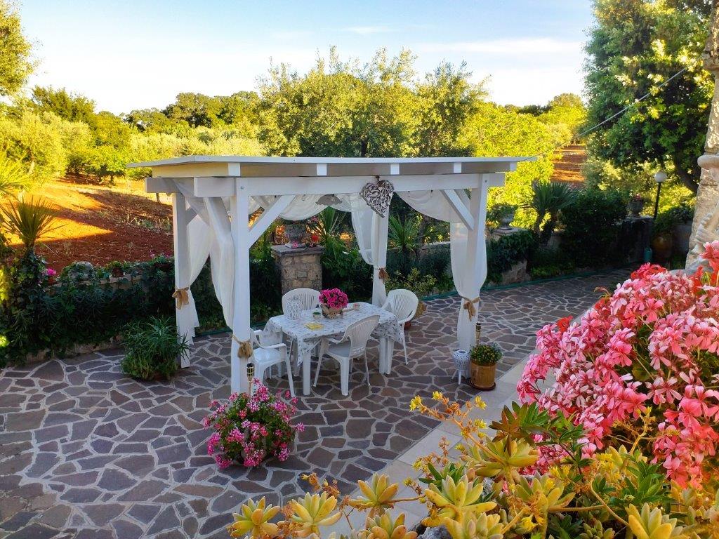 Was bei mir aber besondere Begeisterung ausgelöst hat, ist der Garten des Trullos. Hier zeigt sich das Livianna einen dunkelgrünen Daumen hat, mindestens einen: überall grünt und blüht es, in Töpfen auf Mauern und Terrassen, in Beeten, Zinkeimern… . Hier schaukelt eine Hängematte unter einer Pinie. Dort sitzt man auf rustikalen Holzbänken unter einer Pergola aus Immergrün. Direkt vor der Tür befindet sich eine weitere Sitzgelegenheit unter einer Holzlaube. Und auf der höher gelegenen Terrasse laden Liegestühle zum verweilen ein. Wem zu warm geworden ist, der kühlt sich unter der Außendusche ab. Natürlich gibt es auch ein geräumiges Badezimmer mit Dusche und Waschmaschine im Inneren des Hauses.