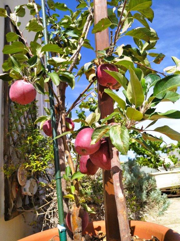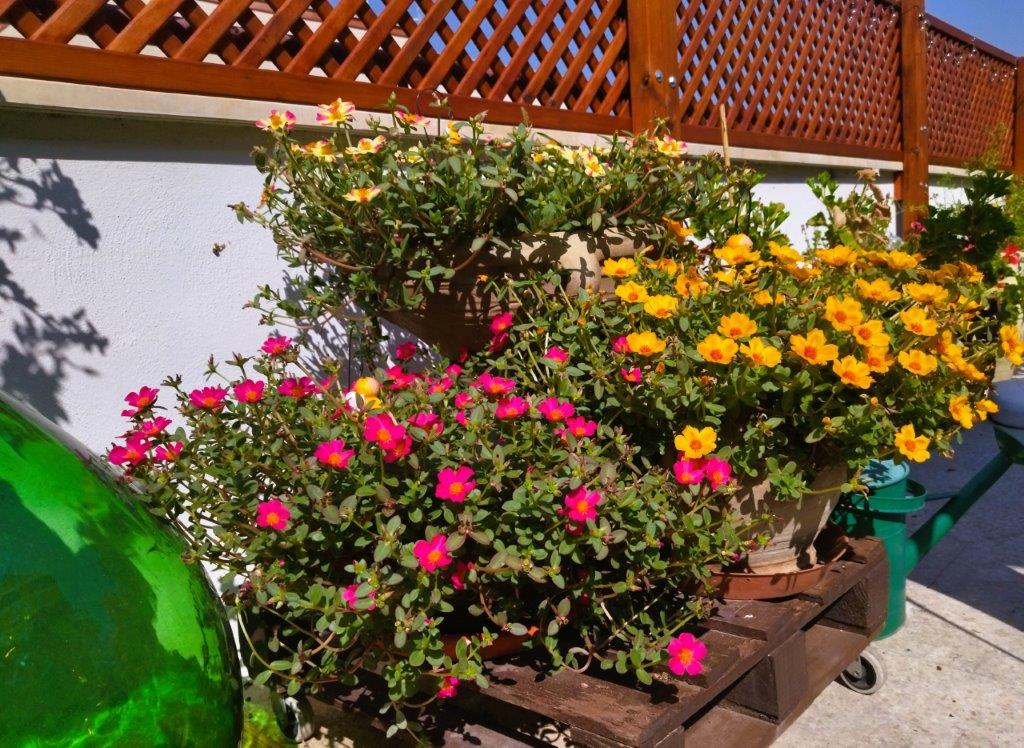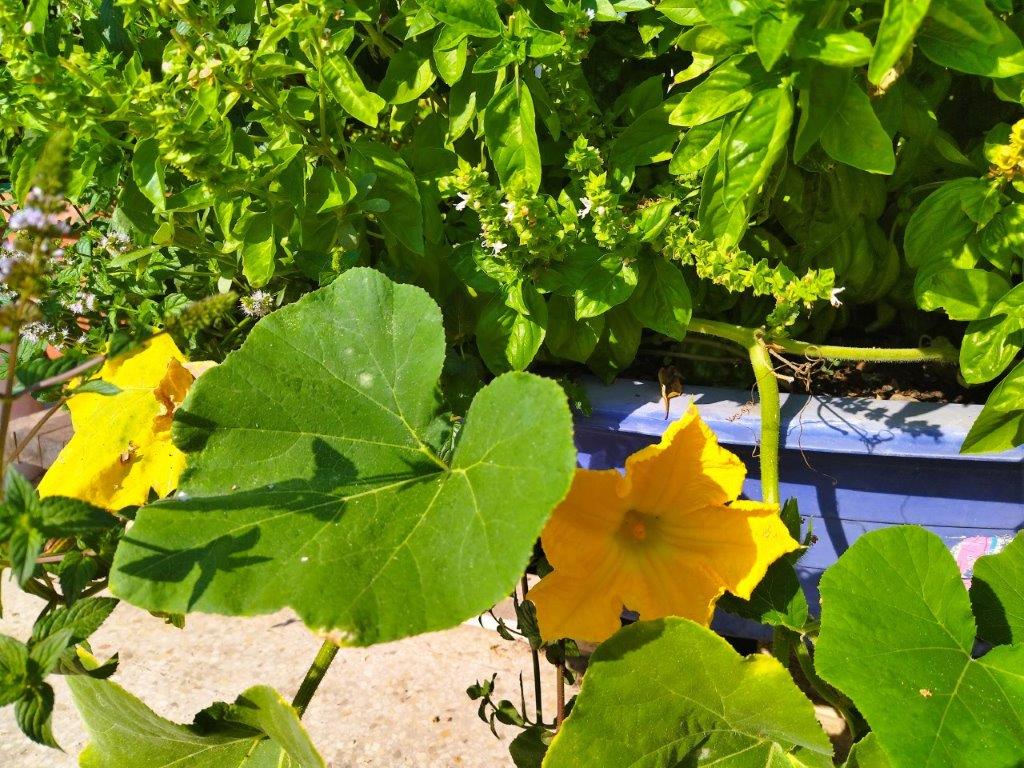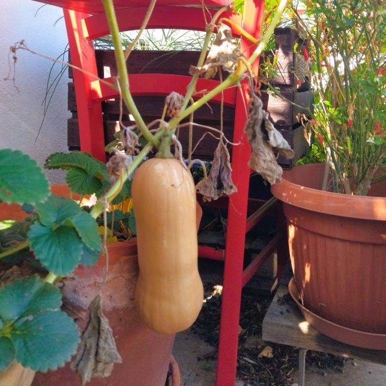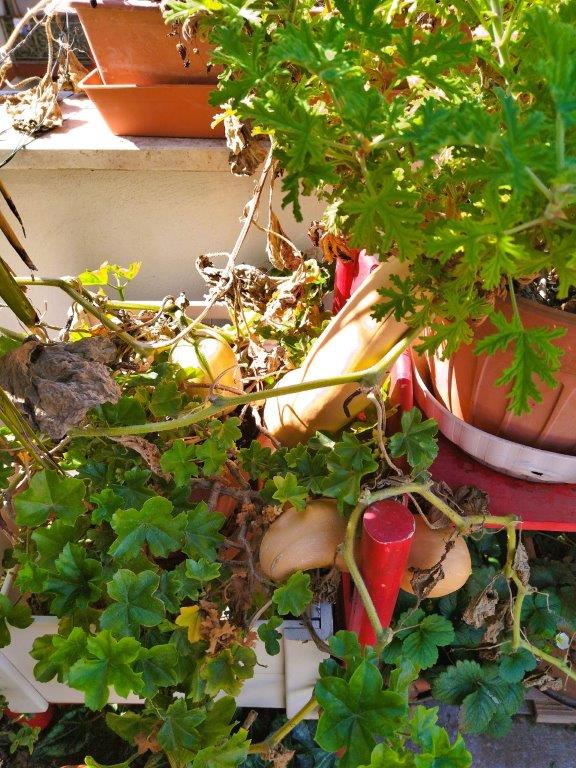 Ich habe vor ein paar Jahren zwei Pumos auf einen Blumenkübelträger aus Holzpaletten geklebt, weil ich fand, dass es schön aussehe. Vielleicht gibt es deshalb so eine üppige Blütenpracht auf unserer Terrasse. Vielleicht haben die diversen Pumos in unserem Haushalt sogar dazu beigetragen, dass unsere Obstbäume in diesem Jahr besonders schwer behangen waren/ sind, sowie dass eine zunächst heimlich im Kräuterbeet gewachsene Kürbispflanze bis heute (Ende September) nicht zu blühen und zu fruchten aufhören will.