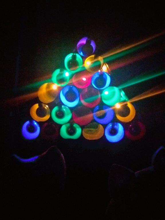 Zum Glück gab es danach gar nicht mehr so viel zu tun. Noch die Rückwand ankleben. Die Pyramide habe ich auch noch beklebt und der Vater kümmerte sich um das anbringen der Lichterkette von hinten. Danach leistete das Weihnachtsbäumchen wie vorgesehen den Katzen auf der Treppe Gesellschaft.