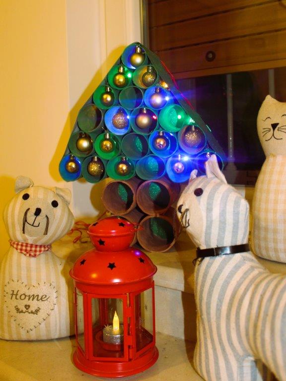 Seit unserer ersten Murmelbahn aus Klopapierrollen im Lockdown 2020 hamstert unser Kind jede leere Rolle und die Aufbewahrungstüte auf dem Balkon ist regelmäßig übervoll. Da man aber nun nicht ständig nur Murmelbahnen bauen kann, sollte es in der letzten Weihnachtszeit ein Weihnachtsbaum als Dekoration für die Treppenstufen aus dem Esszimmer hinaus zur Terrasse sein, wo die Türstoppkatzen überwintern.