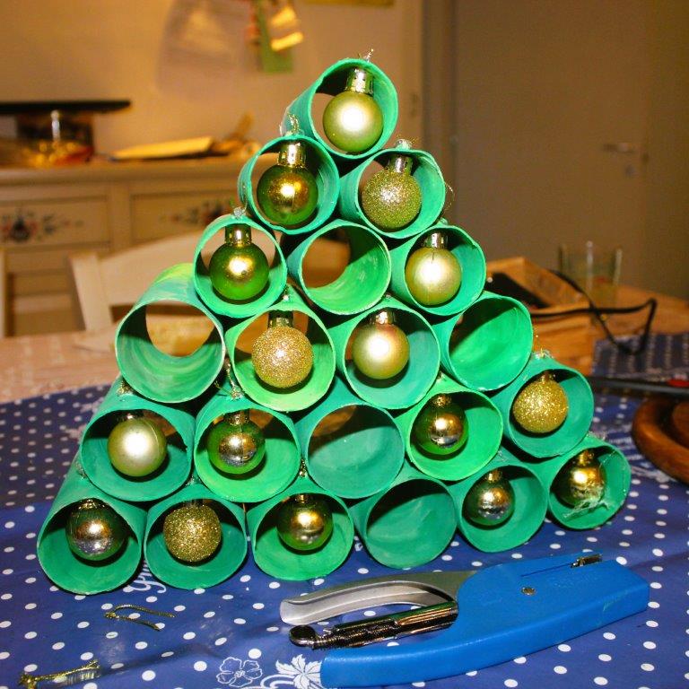 Solche Bastelaktionen mit Kind sind wunderbar für die Mutter-Kind-Bindung enden bei uns jedoch regelmäßig in einer Mutter-Mach-Mal-alleine-Weiter- Situation. Während der Filius bei der Anmalaktion noch begeistert den Pinsel schwang und auch die Plastikweihnachtskugeln aus dem Supermarkt aus ihrer Schachtel befreite, war beim Zusammenklammern der Rollen zu einer Pyramide schon weniger Begeisterung zu spüren. Beim fummligen Anbringen der Kugeln war der Ofen dann ganz aus und das Kind verschwunden.