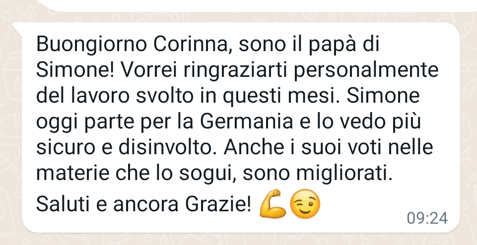 „Guten Tag Corinna, ich bin der Vater von Simone! Ich möchte dir persönlich für die Arbeit danken, die du in diesen Monaten vollbracht hast. Simone fährt heute nach Deutschland ab und ich sehe ihn sicherer und ungezwungener. Auch seine Noten in den Fächern, die du mit ihm verfolgst [Deutsch und Englisch], haben sich verbessert. Grüße und noch einmal: Danke!“