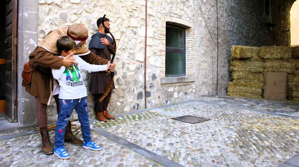 Dazu gibt es Marktstände, an denen man lokale Spezialitäten wie Wildschweinsalami oder Produkte aus Esskastanien probieren kann. Auch die Kastanienröster fehlen nicht und so zieht von mittags bis spät nachts der rauchige Geruch von Maronen durch die Gassen. Neben dem Schloss haben mittelalterliche Ritter ihr Lager aufgeschlagen und zeigen den großen und kleinen Festbesuchern den Umgang mit verschiedenen Waffen. Wer möchte, kann hier und auch direkt im Schlosshof das Bogenschießen ausprobieren. Ein Kürschner zeigt seine Felle und ein Knappe erklärt, woraus eine Ritterrüstung besteht.