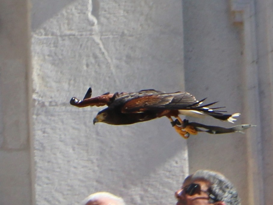 Auch wenn man mit dem Falkner darauf wartet, dass sein Vogel, der sich so weit in den Himmel erhoben hat, dass er nur noch als winziger Punkt am babyblauen Himmel auszumachen ist, wieder zurückkommt. Ja, kommt er denn zurück oder fliegt er einfach weg? Nein, tatsächlich ist er herabgestüzt, um ein paar Stadttauben einen mächtigen Schrecken einzujagen. Wir lachen mit der Menge, aber zweifeln jetzt erst recht, dass sich der Vogel jemals wieder blicken lässt, wo er doch so viel Spaß mit dieser fetten Beute zu haben scheint. Doch die Falkener rufen und locken weiter. An einem langen Seil schwenken sie so lange eine Beute, bis der Vogel tatsächlich seine Runden immer kleiner um uns zieht und sich schließlich auf die Verlockung am Seilende stürzt. Und wieder sind wir erstaunt, wie groß diese Vögel von Nahem sind und wie stolz sie vom Arm ihres Falkners durch uns hindurchzusehen scheinen. Das ist wahre Erhabenheit! …und einen afrikanischen Geier haben wir in Melfi auch zum ersten Mal gesehen.