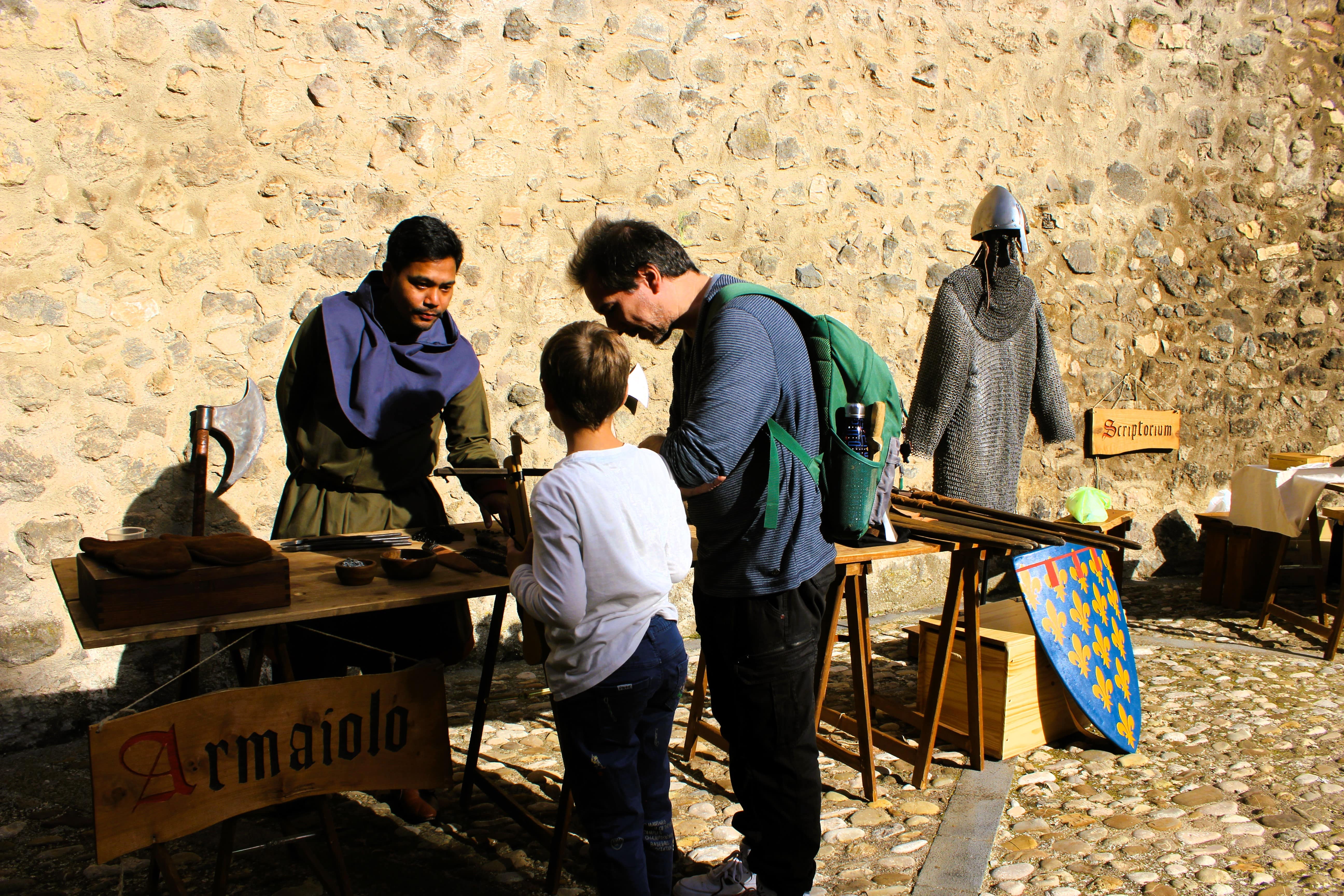 Dazu gibt es Marktstände, an denen man lokale Spezialitäten wie Wildschweinsalami oder Produkte aus Esskastanien probieren kann. Auch die Kastanienröster fehlen nicht und so zieht von mittags bis spät nachts der rauchige Geruch von Maronen durch die Gassen. Neben dem Schloss haben mittelalterliche Ritter ihr Lager aufgeschlagen und zeigen den großen und kleinen Festbesuchern den Umgang mit verschiedenen Waffen. Wer möchte, kann hier und auch direkt im Schlosshof das Bogenschießen ausprobieren. Ein Kürschner zeigt seine Felle und ein Knappe erklärt, woraus eine Ritterrüstung besteht.