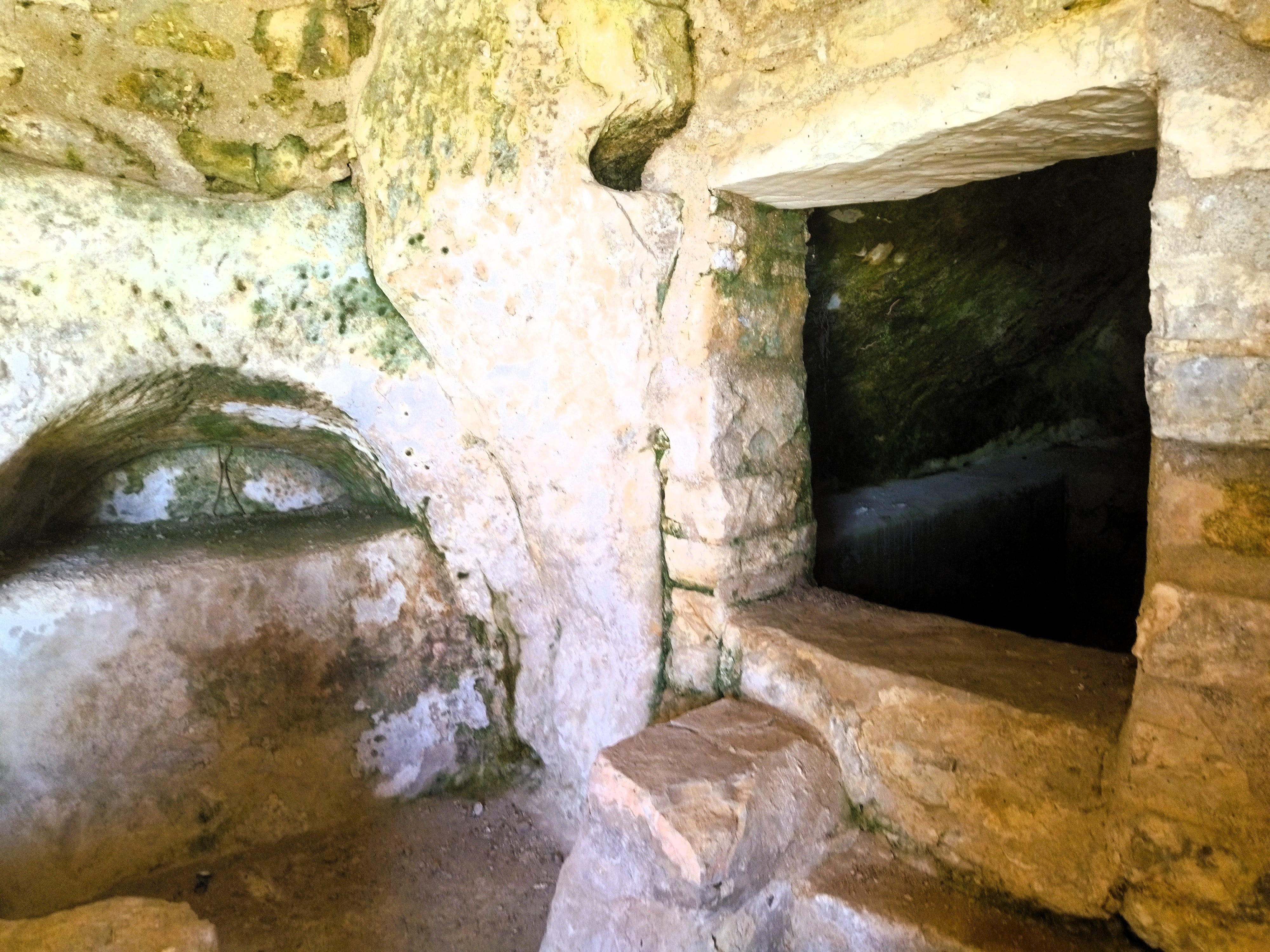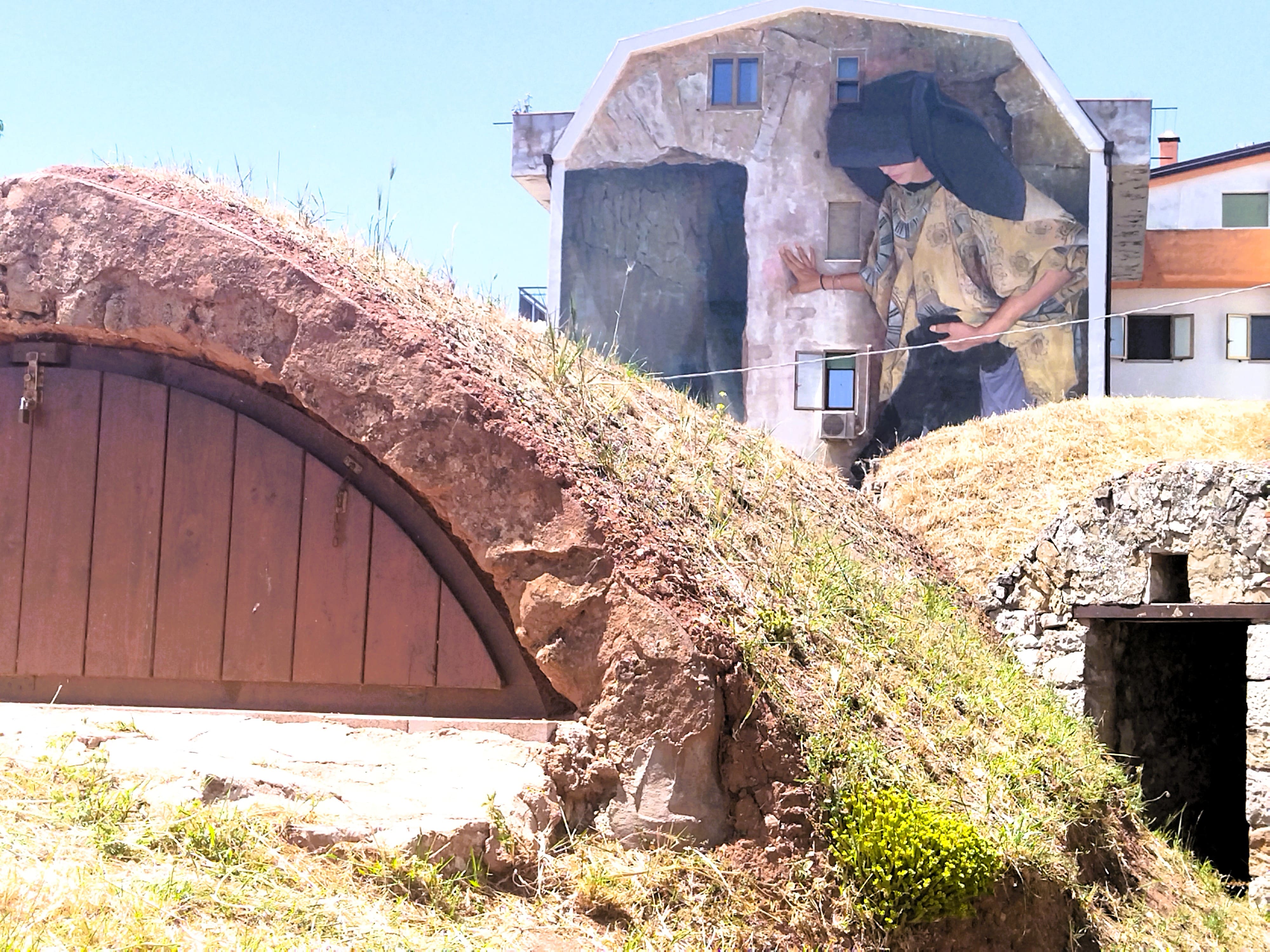 Glücklicherweise hat die Stadt gleich rechts an der Straße einen Parkplatz angelegt, sodass jeder Neugierige kurzentschlossen anhalten und dem Geheimnis auf die Spur kommen kann. Was zunächst als niedliche Häuser mit einer niedrigen Holztür und einem winzigen Fensterloch erscheint, sind nämlich in Wahrheit Zeugnisse eine uralten Tradition der Basilikata, wo viele Bauern auch Weinanbau praktizierten und die sonnenverwöhnten Trauben nicht nur aßen, sondern daraus Wein herstellten. Davon zeugt ein überlebensgroßes Wandbild am Giebel eines modernen Mietshauses, das sich direkt hinter den „Hobbit-Häusern“ erhebt. Darauf ist eine Frau im traditionellen Gewand dargestellt, welche Weintrauben in einem Fass mit ihren nackten Füßen zerquetscht. Den Wein lagerten die Bewohner von Pietragalla dann in den kühlen Höhlen, welche vor der Stadt in den Fels gehauen worden waren. Tatsächlich werden einige dieser sogenannten „palmenti“ bis heute zur Weinlagerung genutzt. Viele der Höhlen sind restauriert worden, andere stehen etwas abseits und sind dem Verfall preisgegeben.