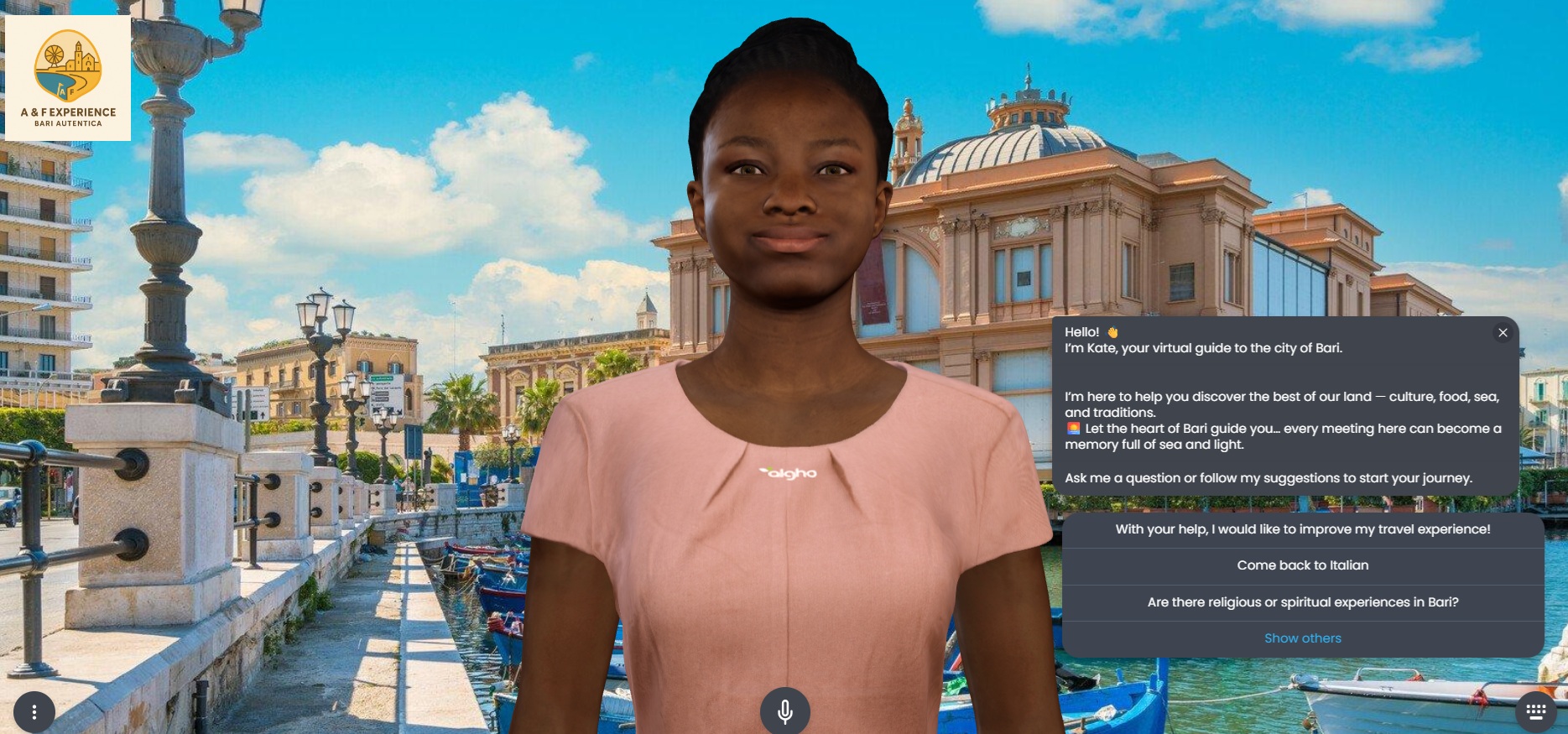 Mit Unterstützung von Chat GPT und Gemini haben wir eine Wissensdatenbank mit 35 detaillierten Fragen und Antworten zu den wichtigsten Touristensektoren in Bari erstellt, sowie mit Bildern und erklärenden Links ergänzt. Unsere Avatars Nicola (Italienisch), Kate (Englisch) und Corinna (Deutsch)…