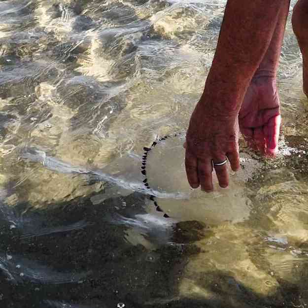 Und natürlich muss man hier auch die Wasserqualität loben. Bei unbewegtem Meer am Morgen war das Wasser kristallklar, sogar so klar, dass ein älterer Herr mit bloßen Händen riesige Quallen an Land jagen und auf den Strand befördern konnte. „Probieren Sie das nicht selbst!“ wies er mich unnötigerweise an, während ich ihn dabei fotografierte.