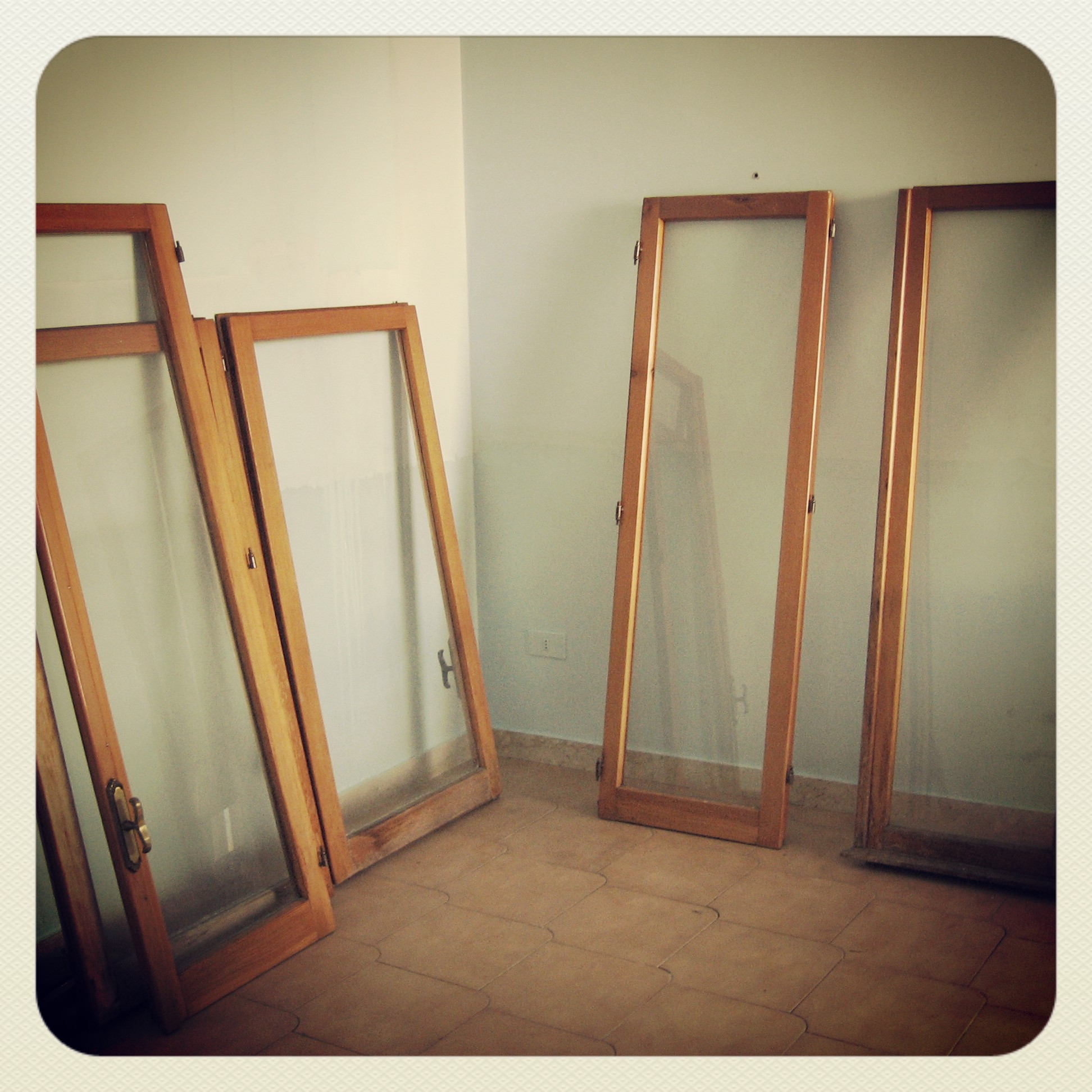Sie begannen damit, dass Luigi mich am Donnerstag exakt in dem Moment anrief, als ich gerade mit triefnassen Haaren unter der Dusche hervorgekommen war, und sagte: „Du hast 15 Minuten Zeit, um unsere Wohnung aufzuschließen. Lorenzo kommt, um die Holzfenster auszubauen.“ Wir erinnern uns: Unsere Traumwohnung ist in den 80er Jahren entstanden. Damals hatte man in der Innenwand der Wohnung Holzfester eingebaut, deren Fensterbretter nach außen zeigten. Eine unbekannte Anzahl von Jahren später waren diese Holzfenster nicht nur niemals gestrichen und daher verwittert sondern auch verzogen und damit undicht geworden. Daher hatte man von außen einfach inzwischen teilweise rostige mit Plastik beschichtete andere Fenster eingebaut und die Holzfenster gelassen, wo sie waren. Nun wollten die Fensterbauer im ersten Schritt die inneren Fenster ausbauen und entsorgen, bevor sie demnächst auch die anderen Fenster aus- und die neuen einbauen werden.