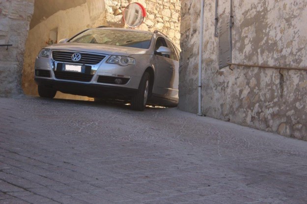 Immer, wenn ich sehe, welche Fahrkünste süditalienische Altstädte abverlagen, bin ich froh, dass wir nur einen winzigen Panda fahren. Hier ein bewundernswertes Manöver eines Einheimischen  um eine 90 Grad-Kurve mit 30%-Gefälle in Bovino.