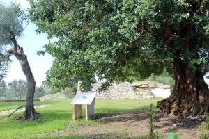 Hinter alten Olivenbäumen erheben sich die Trockensteinmauern des Dolmen.