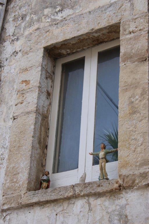 Turi Sant Oronzo neben Domenico ModugnoWie selbstverständlich und eng in Süditalien der Glauben mit dem täglichen Leben verknüpft ist, zeigt dieses Fenster in der Altstadt von Turi: Der Stadtpatron „Sant’Oronzo“ steht auf einem Fensterbrett gleich neben einer Figur des in Polignano a Mare geborenen Sängers Domenico Modugno („Volare“). Ein bisschen kitschig ist es schon, aber irgendwie auch sympathisch patriotisch.